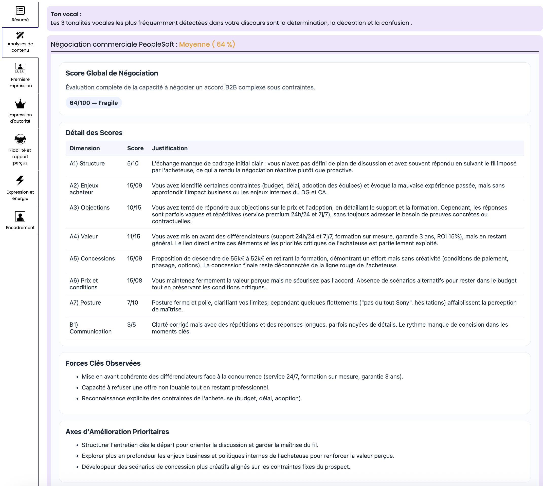 L’IA assure le respect scrupuleux des contenus créés par nos SensAIs tout en intégrant vos process et vos singularités organisationnelles et fonctionnelles. Elle délivre ensuite des feedbacks détaillés et étayés.